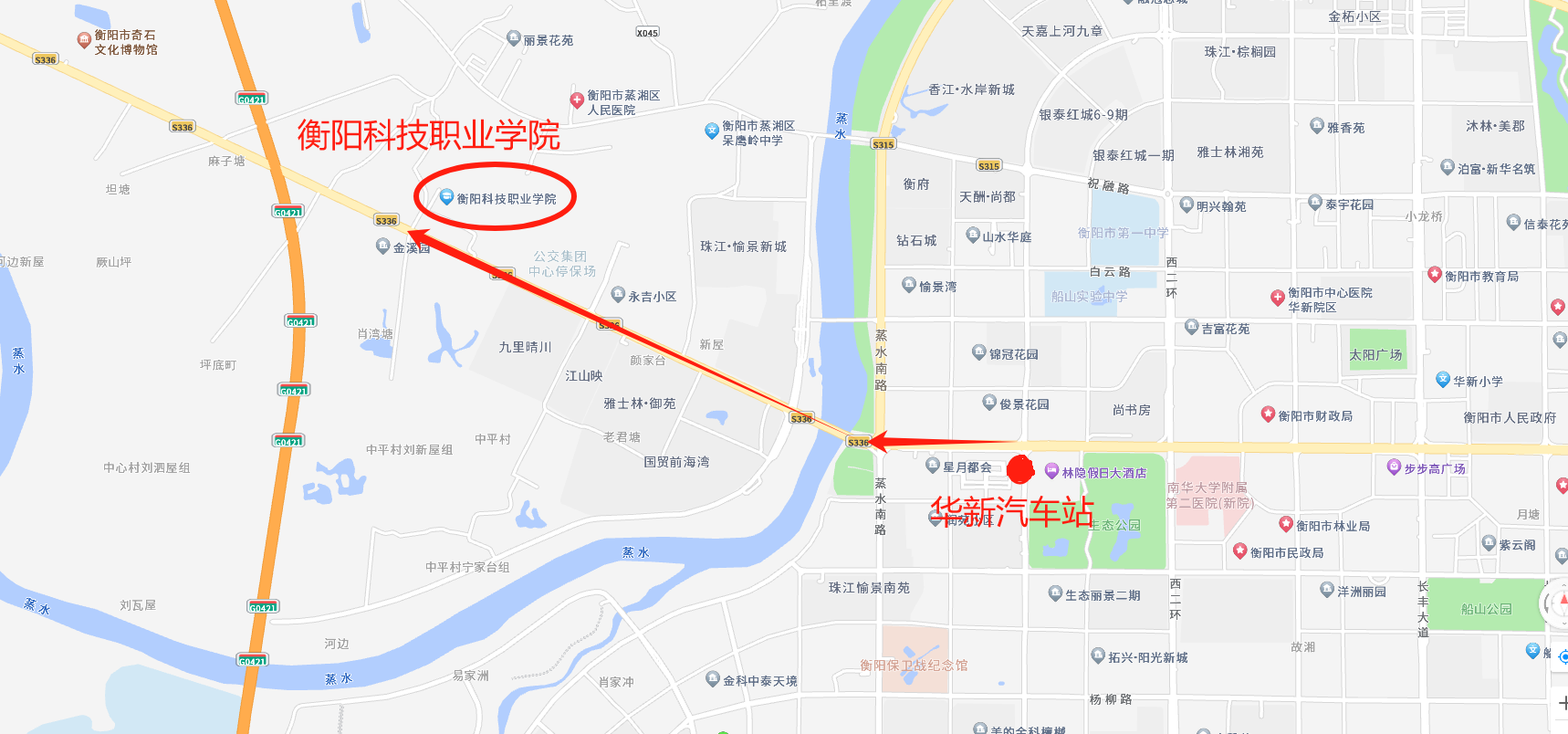 2、高铁站至皇冠app安卓下载安装:从高铁衡阳东站下车的同学乘145路公交车到华新汽车站转乘141路公交车到皇冠app安卓下载安装下车即到学校