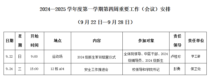 2024—2025学年度第一学期第四周重要工作(会议)安排(9月22日-9月28日)_周工作安排_皇冠365官方app