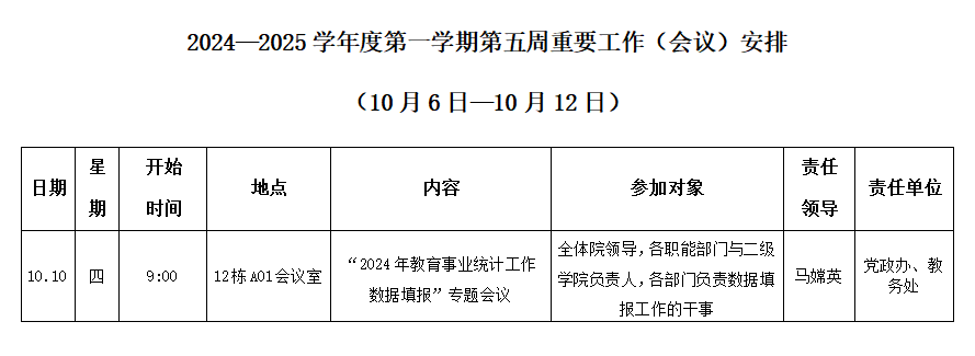 2024—2025学年度第一学期第六周重要工作(会议)安排(10月6日-10月12日)_周工作安排_皇冠365官方app