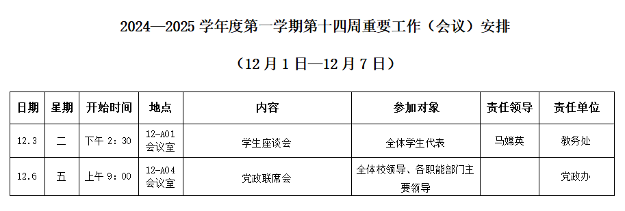 2024—2025学年度第一学期第十四周重要工作(会议)安排(12月1日-12月7日)