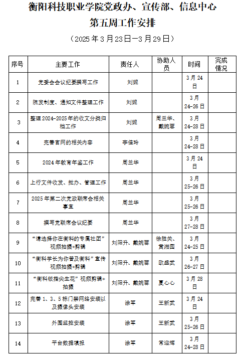 皇冠app安卓下载安装党政办、宣传部、信息中心 第五周工作安排_周工作安排_皇冠app安卓下载安装