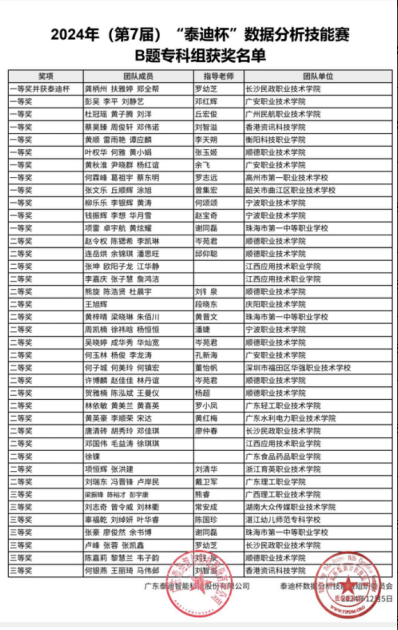 2024年12月5日,2024年(第7届)“泰迪杯”全国大学生数据分析技能赛颁奖典礼圆满落幕。由李天朔老师指导,黄顺、雷雨燕、谭应麟三位同学组成的团队凭借《基于营养数据的特医食品优化模型》课题,荣获一等奖,展现了我校在数据分析与健康营养领域的卓越实力。
