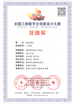 2024年11月2日,2024年全国三维数字化创新设计大赛(简称“全国3D大赛”)颁奖典礼圆满落幕。由向俊威、陈天远老师指导,谢成杰、罗明东同学组成的团队凭借《智能物流搬运机器人》项目,荣获省部级A类二等奖,展现了我校在智能制造与数字化创新领域的突出实力。