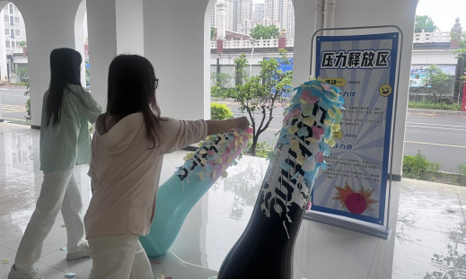 而 “击打压力源” 的不倒翁沙袋前,一位同学正挥着泡沫锤大声喊着:“拖延症,快走开!” 沙袋上的 “焦虑”“迷茫” 等词语在击打下轻轻晃动,仿佛在同学们的勇气面前逐渐退散。不少同学表示,这种 “硬碰硬” 的解压方式格外酣畅淋漓。