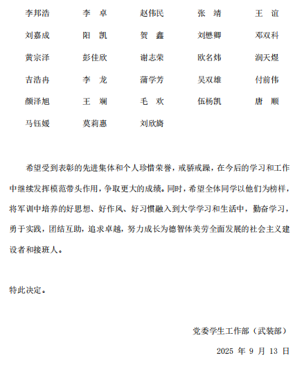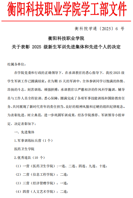 衡科院学通〔2025〕6号关于表彰 2025 级新生军训先进集体和先进个人的决定