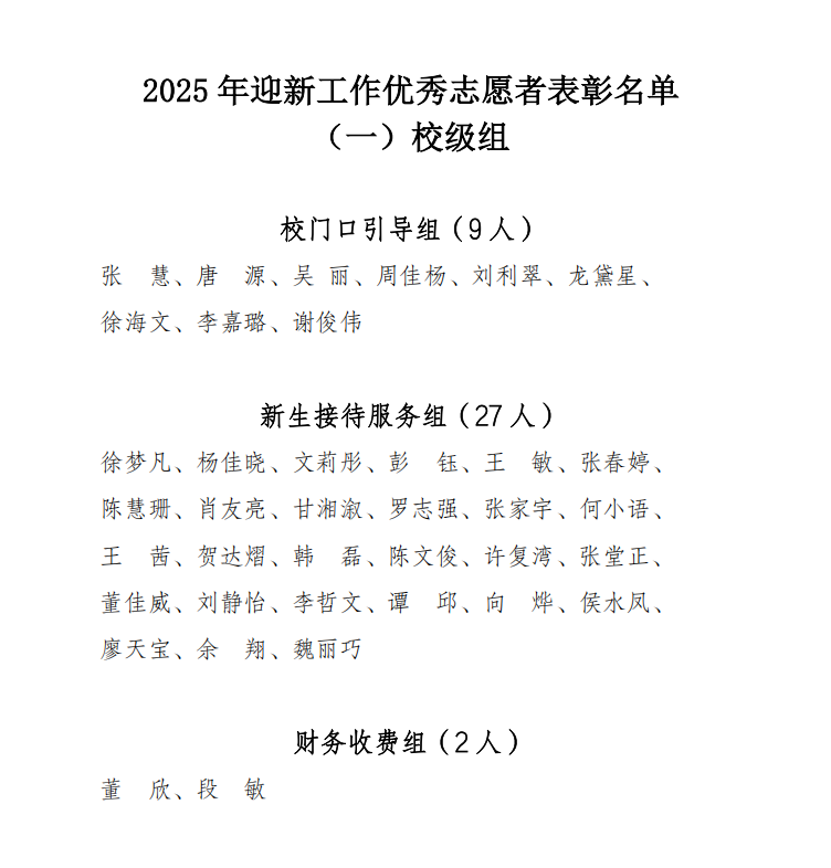 在 2025 年迎新工作中,学生志愿者为 2025 级新生提供了“安全、顺畅、温馨、周到”的迎新服务,协助完成各项新生接待工作,每人累计服务时长超 33 小时,赢得了新生和家长的高度赞赏,展示了皇冠app安卓下载安装学子良好的素养和形象。为表彰先进、弘扬正气、传播正能量,充分发挥青年典型示范引领作用,激发广大青年学子的责任感和使命感,决定授予张慧等 80 名同学迎新工作“优秀志愿者”荣誉称号。 希望受到表彰的同学珍惜荣誉、再接再厉,继续发挥模范带头作用,同时,号召全体同学以他们为榜样,积极参与志愿服务,践行志愿精神,为校园建设贡献力量。 如对拟推对象有异议,请于 2025 年 9 月 12 日 17:00 前向校团委反映,联系人:闵老师,联系地址:11 栋 101 室,逾期不受理。