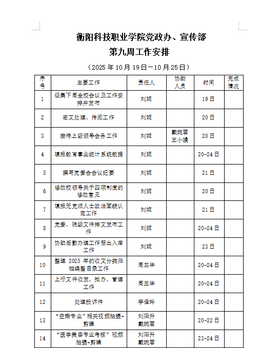 皇冠365官方app党政办、宣传部第九周工作安排(10月19日-10月25日)_周工作安排_皇冠365官方app