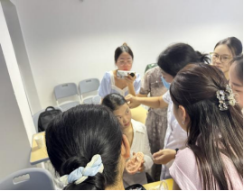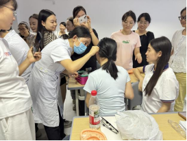 理论赋能,实践引领。讲座的高潮部分是互动实操环节。杨丽平、刘英、李丽平3位专家亲自指导师生们在模型和彼此身上进行定位、消毒、分组贴压豆粒的实践操作。“这里对应的是‘神门’,有安神助眠的效果;这里是‘胃区’,可以调理脾胃……”专家们手把手地教学,同学们聚精会神地聆听、模仿,现场学习气氛异常热烈。一颗颗细小的王不留行籽豆粒,在专家们的手中仿佛被赋予了神奇的魔力,激发了老师们极大的学习兴趣。