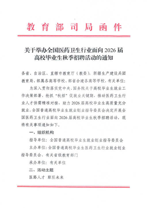 关于举办全国医药卫生行业面向2026届高校毕业生秋季招聘活动的通知