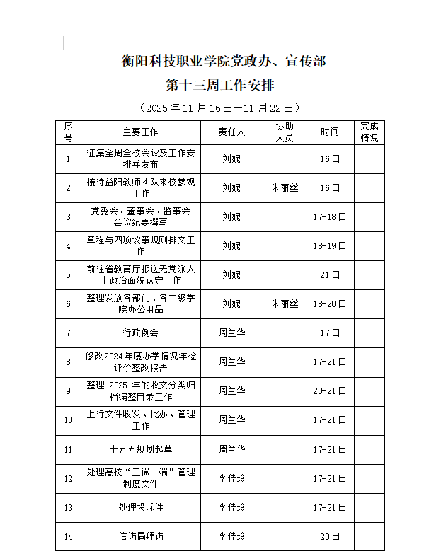 皇冠365官方app党政办、宣传部 第十三周工作安排(11月16日-11月22日)_周工作安排_皇冠365官方app
