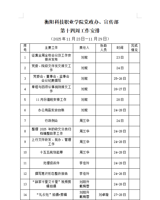 皇冠365官方app党政办、宣传部 第十四周工作安排(11月23日-11月29日)_周工作安排_皇冠365官方app